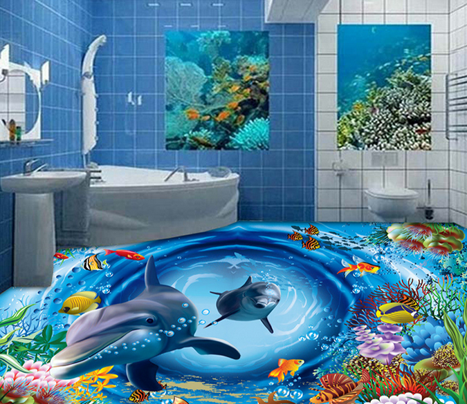 3D Beautiful Dolphins 216 Floor Mural Self-Adhesive Sticker Bathroom Non-slip Waterproof Flooring Murals
