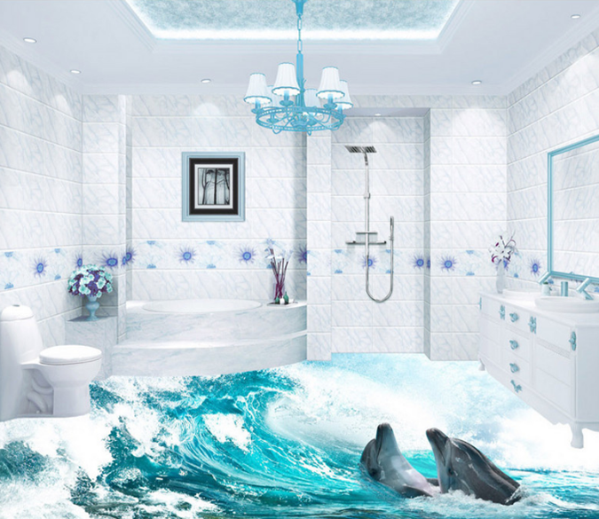 3D Surf Dolphins 098 Floor Mural Self-Adhesive Sticker Bathroom Non-slip Waterproof Flooring Murals