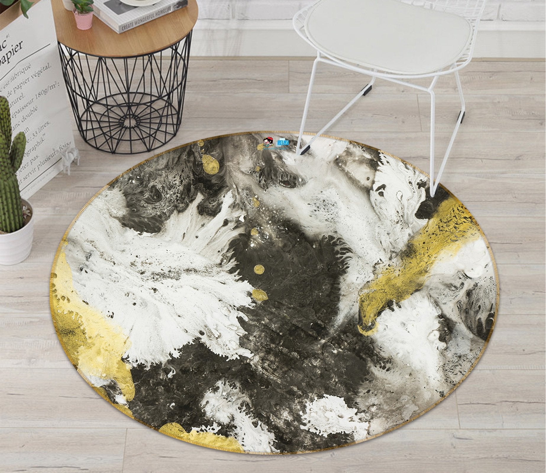3D White Black Gold Flow 111 Round Non Slip Rug Mat