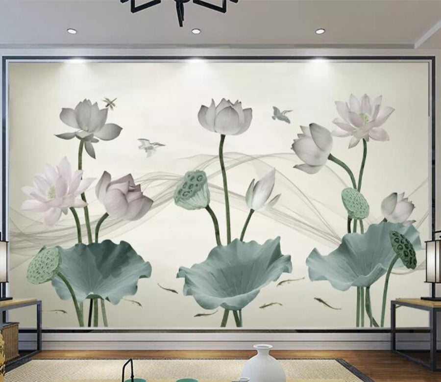 3D Lotus Dragonfly Bird WC2482 Wall Murals