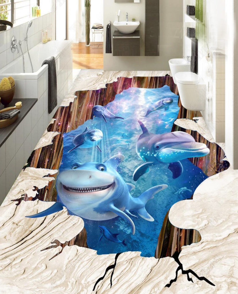 3D Smiling Shark 073 Floor Mural Self-Adhesive Sticker Bathroom Non-slip Waterproof Flooring Murals