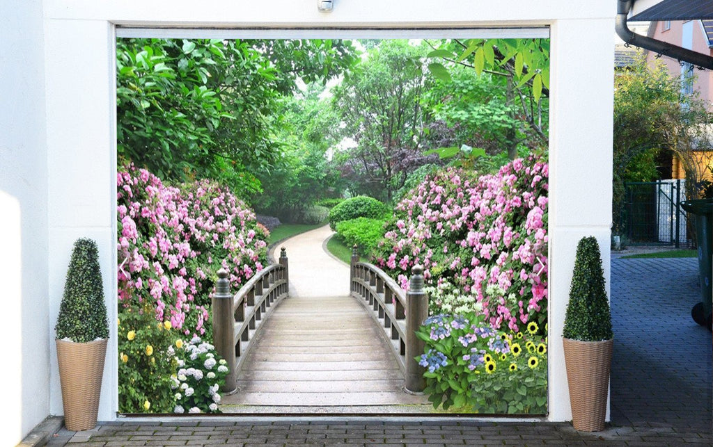 3D Wood Bridge Flowers 318 Garage Door Mural
