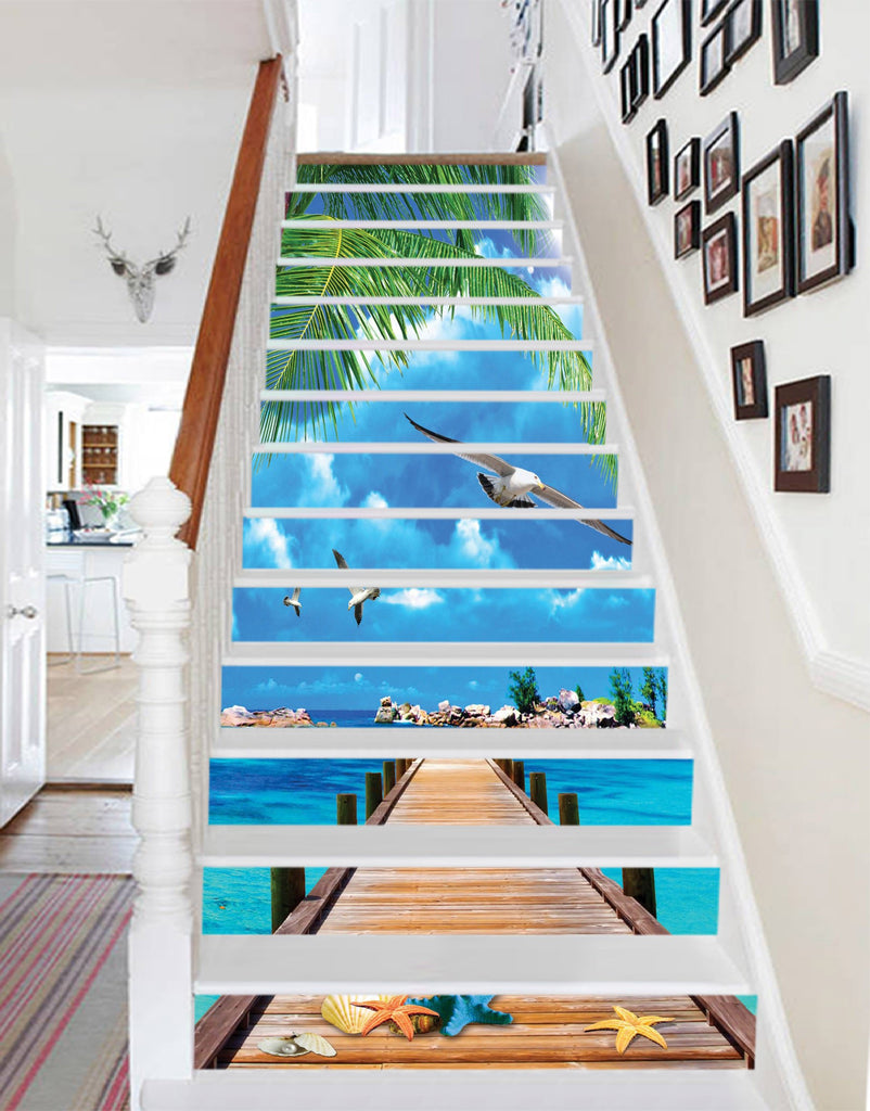 3D Blue Sea Wood Bridge 1286 Stair Risers