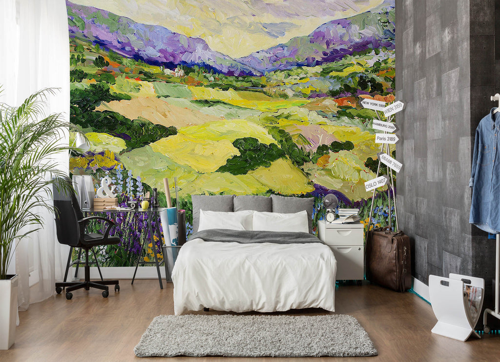 Make sure the wall surface is flat, clean and smooth. A clean and dry wall will help the adhesive from your wall mural to keep its stickiness. Put all panels on the ground, check the order. Measure and write down the dimensions of each panel. Mark vertical guidelines according to the panel's dimensions. Leave 2-3cm overlap between panels.