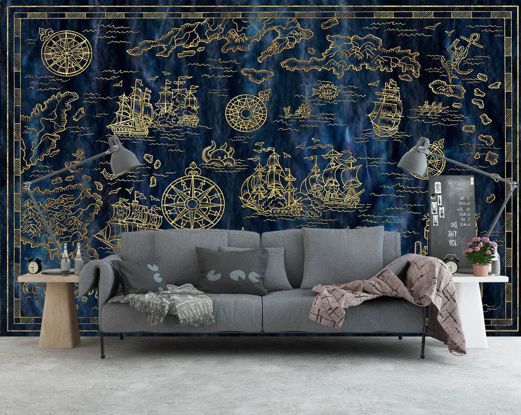 3D Golden Ship 2128 World Map Wall Murals Dai