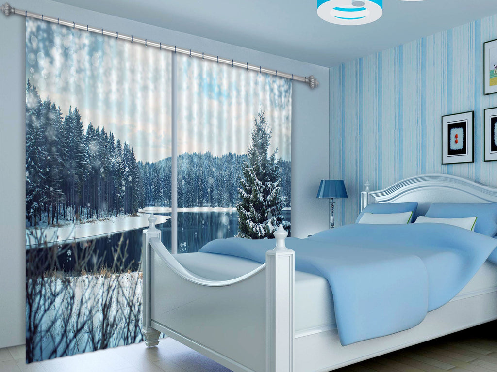 3D Snowing Forest Lake 402 Curtains Drapes
