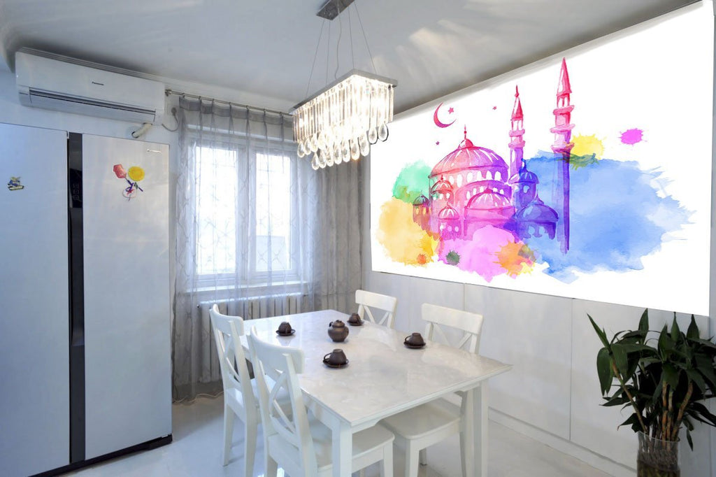 Make sure the wall surface is flat, clean and smooth. A clean and dry wall will help the adhesive from your wall mural to keep its stickiness. Put all panels on the ground, check the order. Measure and write down the dimensions of each panel. Mark vertical guidelines according to the panel's dimensions. Leave 2-3cm overlap between panels.