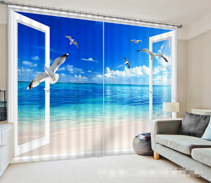 3D Window Sea Seagulls 1272 Curtains Drapes