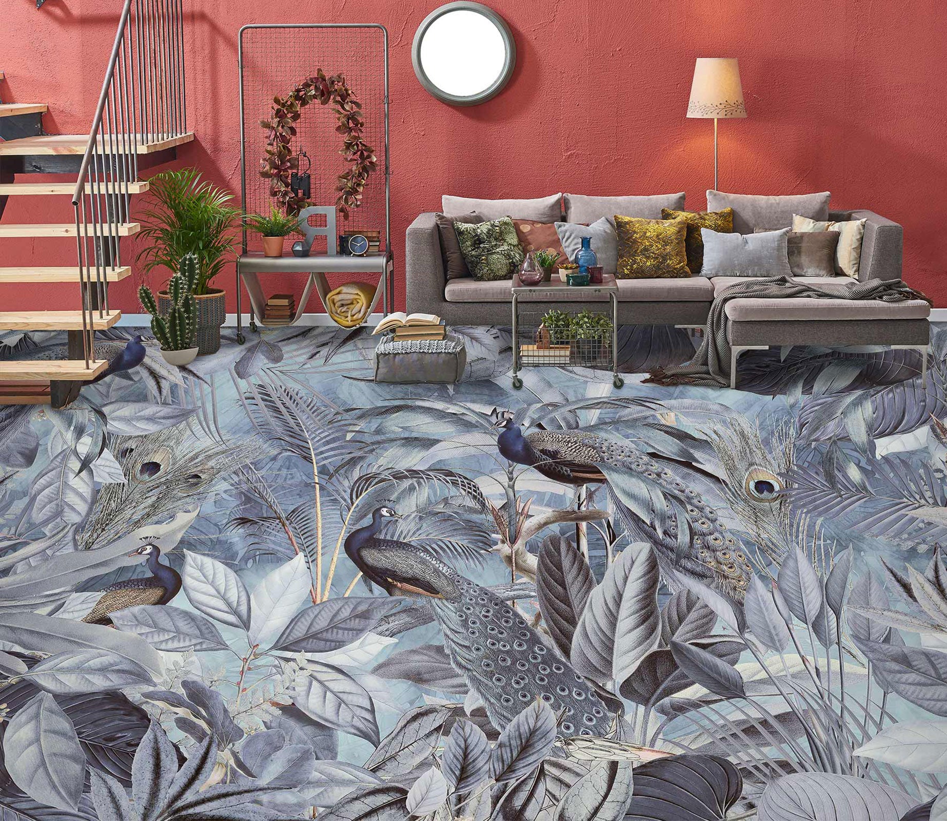 3D Grey Peacock Leaves Grove 10037 Andrea Haase Floor Mural Wallpaper Murals Self-Adhesive Removable Print Epoxy
