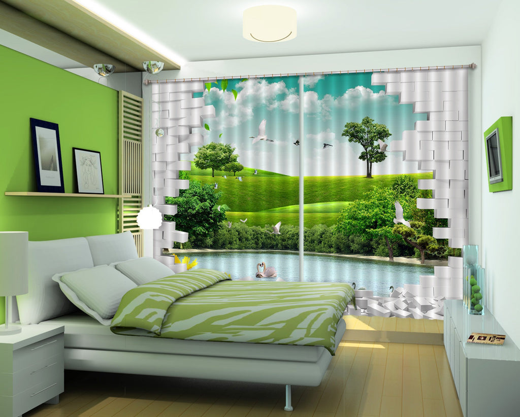 3D Lake Birds Grassland Bricks 357 Curtains Drapes