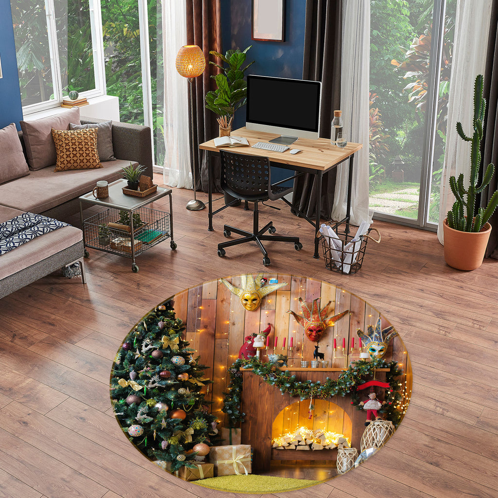 3D Tree Fireplace 55233 Christmas Round Non Slip Rug Mat Xmas Sinsin