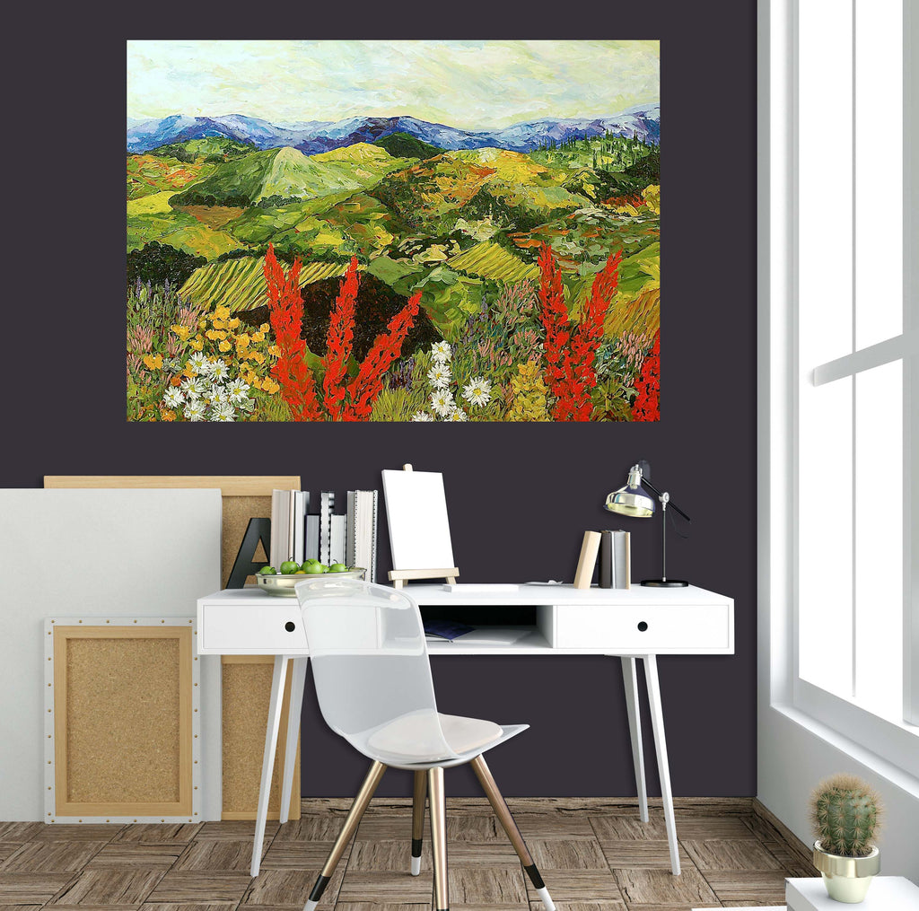 Make sure the wall surface is flat, clean and smooth. A clean and dry wall will help the adhesive from your wall mural to keep its stickiness. Put all panels on the ground, check the order. Measure and write down the dimensions of each panel. Mark vertical guidelines according to the panel's dimensions. Leave 2-3cm overlap between panels.