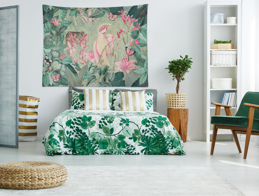 3D Pink Bird Flowers Green Leaves 11839 Andrea haase Tapestry Hanging Cloth Hang