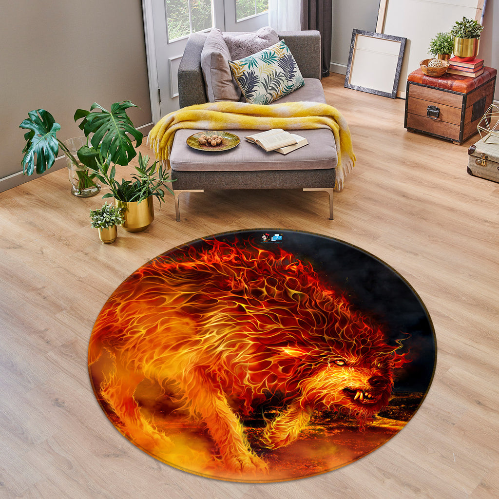 3D Flaming Wolf 4196 Tom Wood Rug Round Non Slip Rug Mat