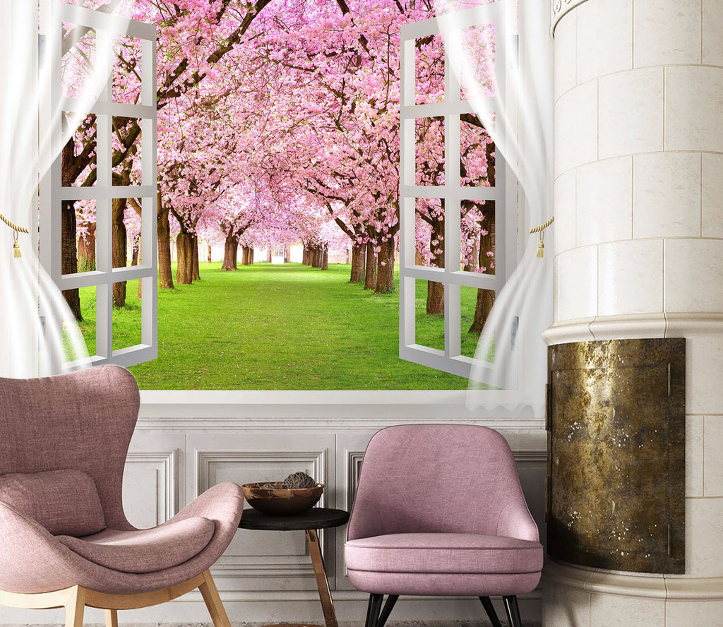 3D Window Cherry Forest 011 Wall Murals Zoe
