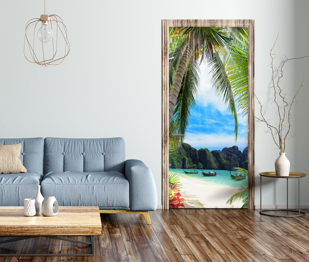 3D Beach Boat Tree 238 Door Mural Zoe