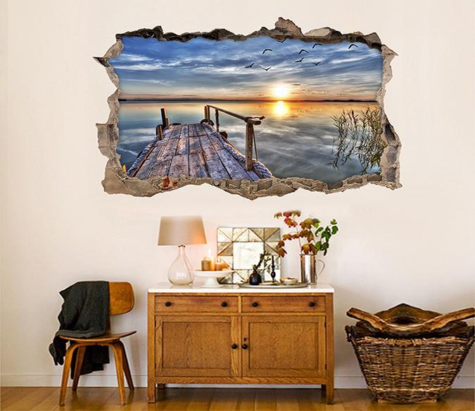 3D Sea Wood Corridor Sunset 333 Broken Wall Murals