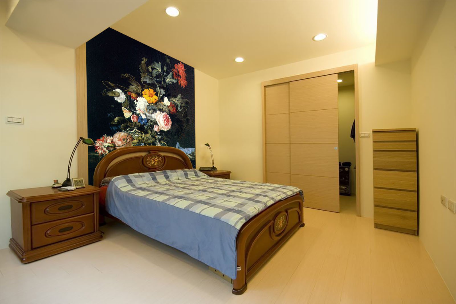 A clean and dry wall wil help the adhesive from your wall mural to keep its stickiness.Put all panels on the ground, check the order. Measure and write down the dimensions of each panel. Mark vertical guidelines according to the panel's dimensions. Leave 2cm overlap between panels.